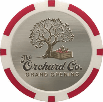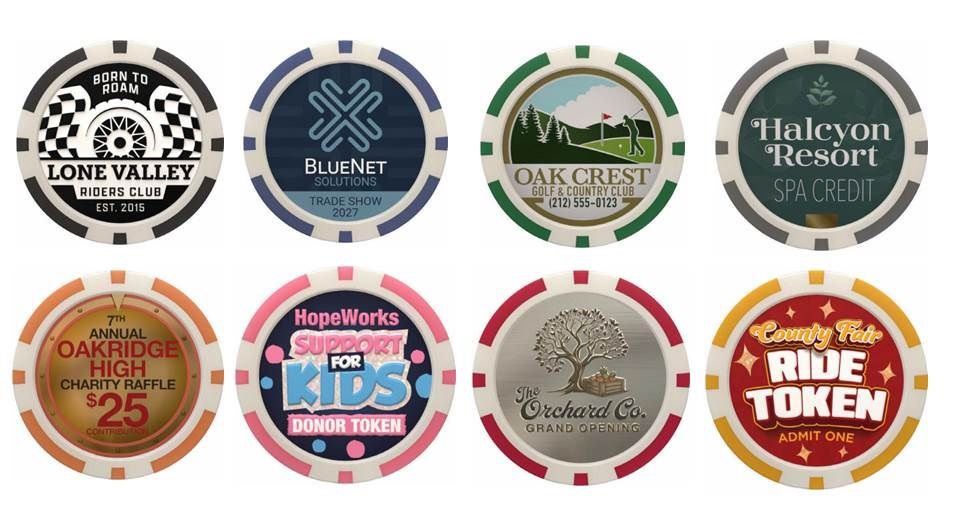 Custom poker chip golf ball markers with your logo imprinted on one or both sides. These are poker chips are 1 3/8" diameter with a 1 1/8" diameter imprint area. Available in 8 colors with your logo applied using a UV printing process giving a 3D feel to the chip!