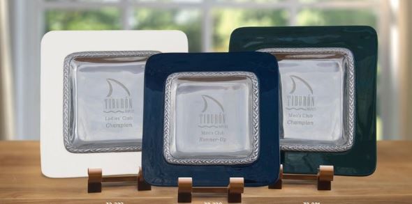 The Stockton Golf Trophy Tray is made of sand cast aluminum with an enamel rim, is tarnish free and has braided trim detail. This golf award comes in two sizes and three rim color options with your logo and/or text engraved on it. Wood stand included!