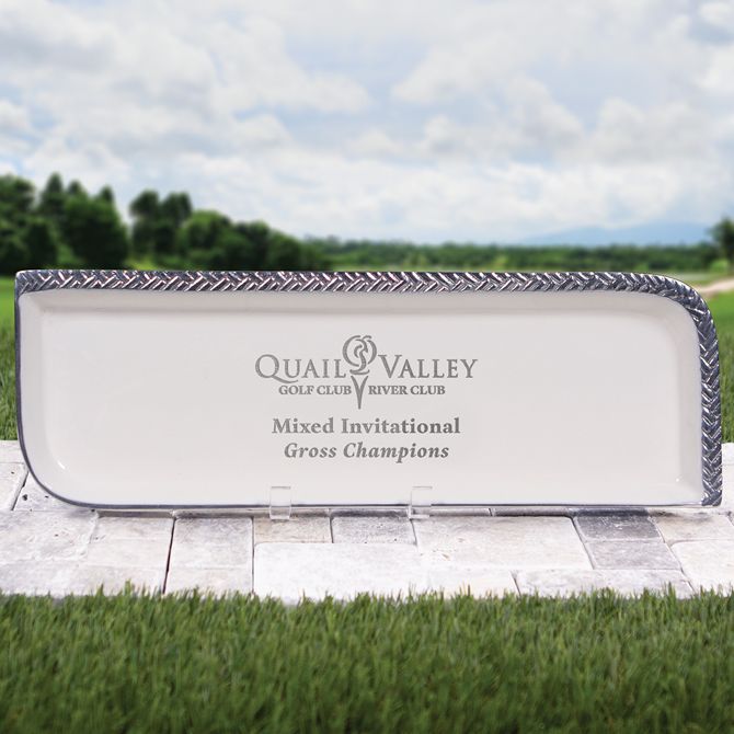 The Formaggio Award Tray is made of sand cast aluminum with an enamel coating and a braided trim detail. This golf award comes in two sizes for your winners and your logo and/or text will be engraved on it. Wood stand included!