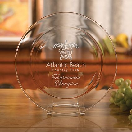 The Laurel Golf Trophy Plate is made of fine imported glass with an etched laurel pattern on the rim. Your logo/text will be etched in reverse on the bottom of the plate showing through the front as an attractive memento for your golf tournament or event . This golf award comes in two sizes and includes a wood stand.