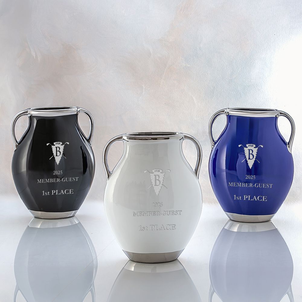 The Russel Trophy Vase has a robust design with handles made of ceramic with polished glazed finish. Available in three color options all standing 12" tall, this trophy will be a fan favorite for your tournament winners! Your logo and text are carefully etched into this beautiful pieces usig a sandcarving engraving process